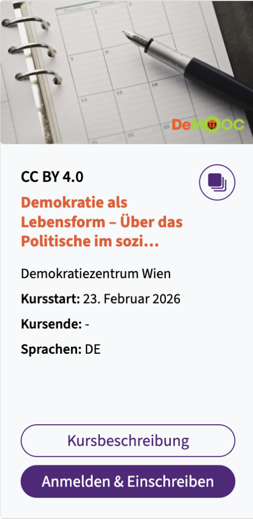 Das Demokratiezentrum hat einen weiteren MOOC auf iMooX.at heute gestartet mit dem Titel „Demokratie als Lebensform – Über das Politische im sozialen Miteinander„